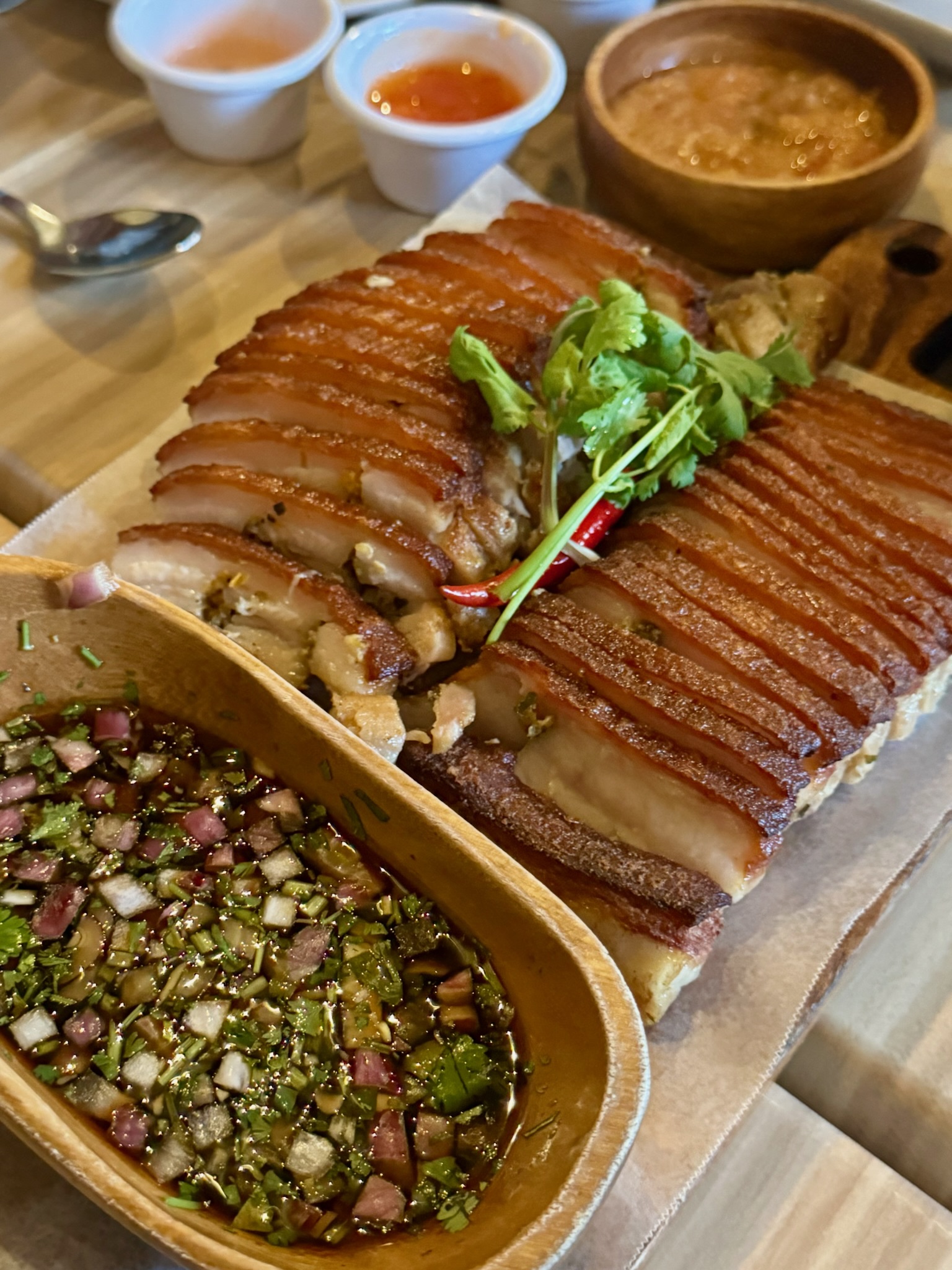 The Lechon served with mustard leaves and fermented rice with shrimp is a dream dish.