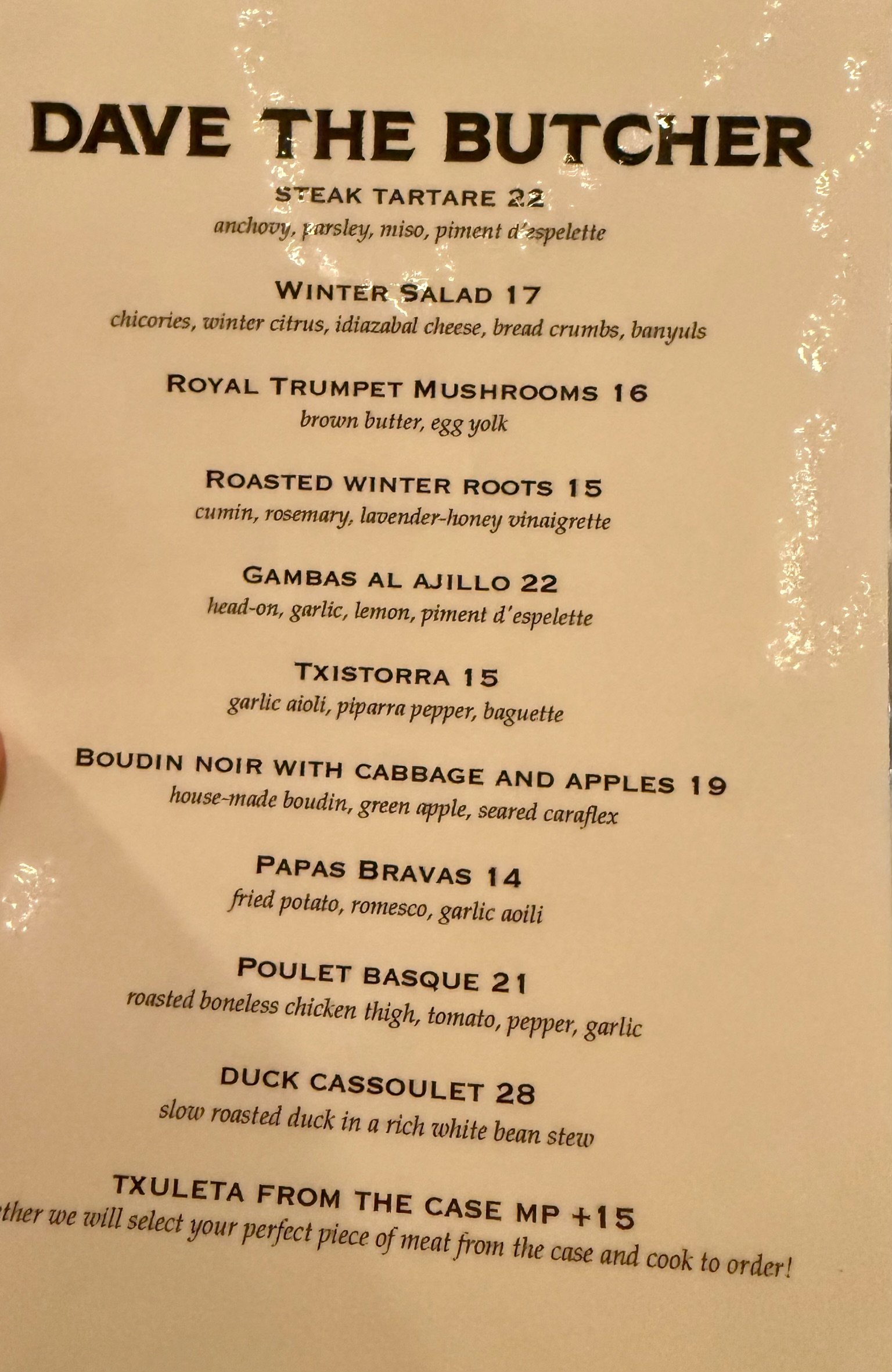We got a lesson in how the the PH of the meat affects fat color and texture. This butcher-shop-by-day swaps out to a Basquaise restaurant on Fri and Sat nights. Pick whatever they have in the case and they will cook it up for you.